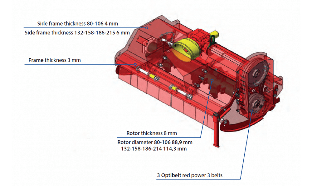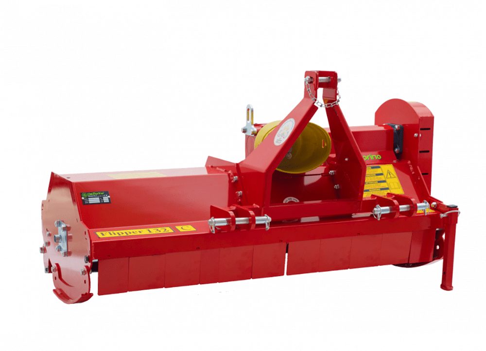 The Del Morino Heavy Duty Flail Mower is suitable for 25-70hp tractors with CAT1 or 2 three point hitch. It is supplied with a universal CAT4 PTO shaft. It boasts a cast iron gearbox with a free wheel device, three belt drive with adjustable tensioner, a rotor with heavy duty hammers, adjustable rear roller, adjustable skids & mounting points for a hydraulic side shift.