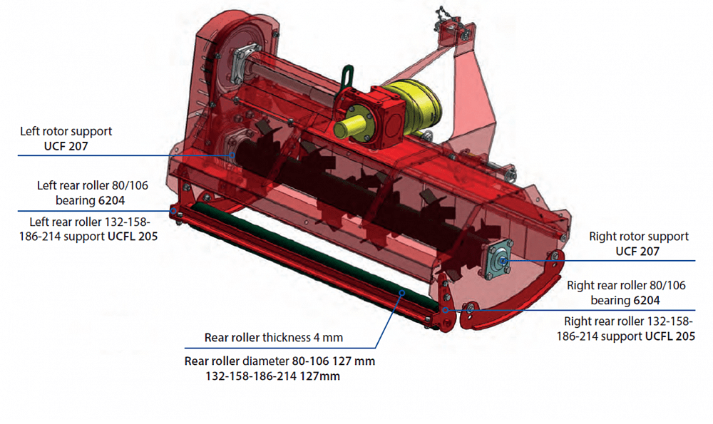 - Cast iron gearbox 540 rpm with free wheel and pass through shaft.