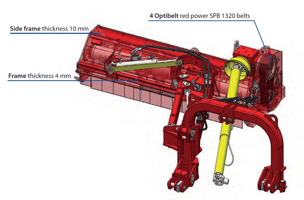 It has a hydraulic side shift adjustment which enables the user to not just shift the machine to the left or right but also have optimal control on embankments and slopes. This side shift adjustment makes the machines highly maneuverable and can be used as an in-line flail mower behind the tractor, or fully offset to the left, with a cutting angle between -50 and +90 degrees of horizontal. This means that verges, banks, ditches or even the side of low hedges can be maintained with a single machine.