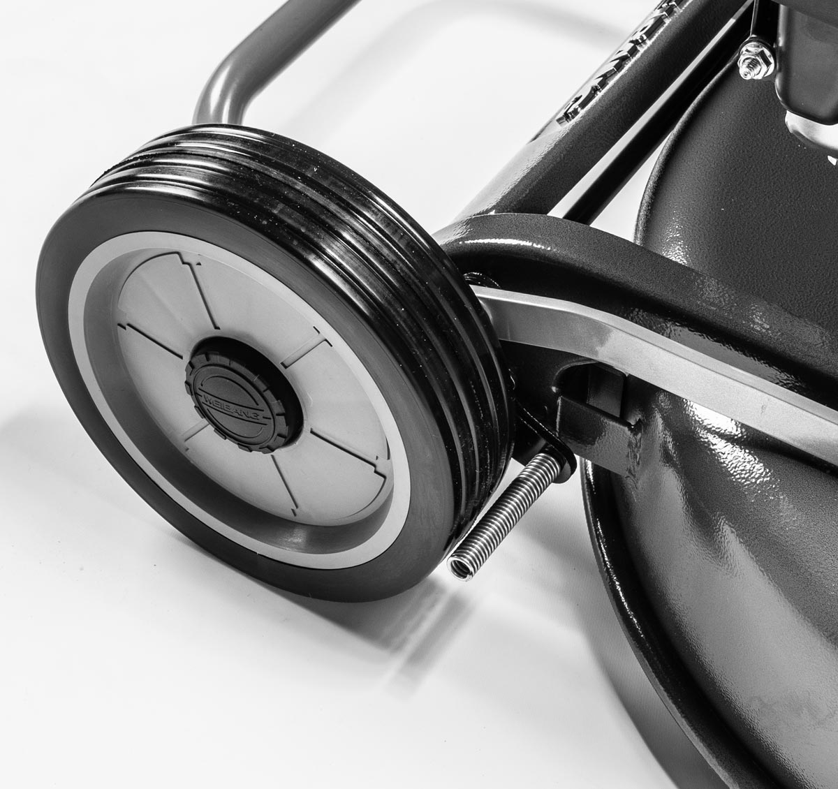 The Virtue dedicated mulching range feature heavy duty double ball bearing wheels with steel spring scrapers to remove cut grass from the tread avoiding grass clumps being left behind while mowing.